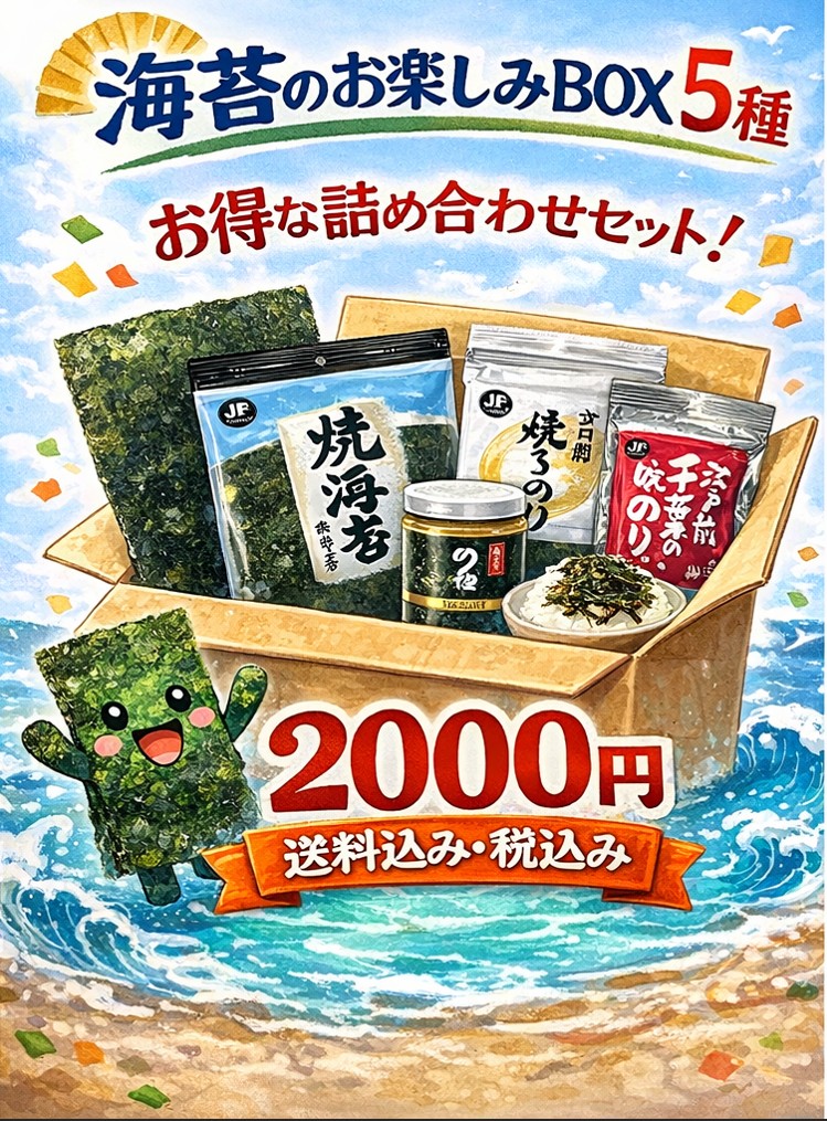 家庭用のり(単品売り) 【数量限定】海苔のお楽しみBOX5種 販売価格 2,000円(税込み) 会員価格 (税込み) 通常価格 (税込み) 在庫 商品コード JANコード 数量 - + カートに入れる カテゴリー 家庭用のり(単品売り) キャンペーン 期間限定/数量限定 特価品 個別送料 0円 ツイートする シェアする 2026年04月 日 月 火 水 木 金 土 1 2 3 4 5 6 7 8 9 10 11 12 13 14 15 16 17 18 19 20 21 22 23 24 25 26 27 28 29 30 2026年05月 日 月 火 水 木 金 土 1 2 3 4 5 6 7 8 9 10 11 12 13 14 15 16 17 18 19 20 21 22 23 24 25 26 27 28 29 30 31 定休日 休業日 ショッピングガイド 特定商取引法に基づく表記 個人情報保護方針 送料について 会員規約 お問合せ